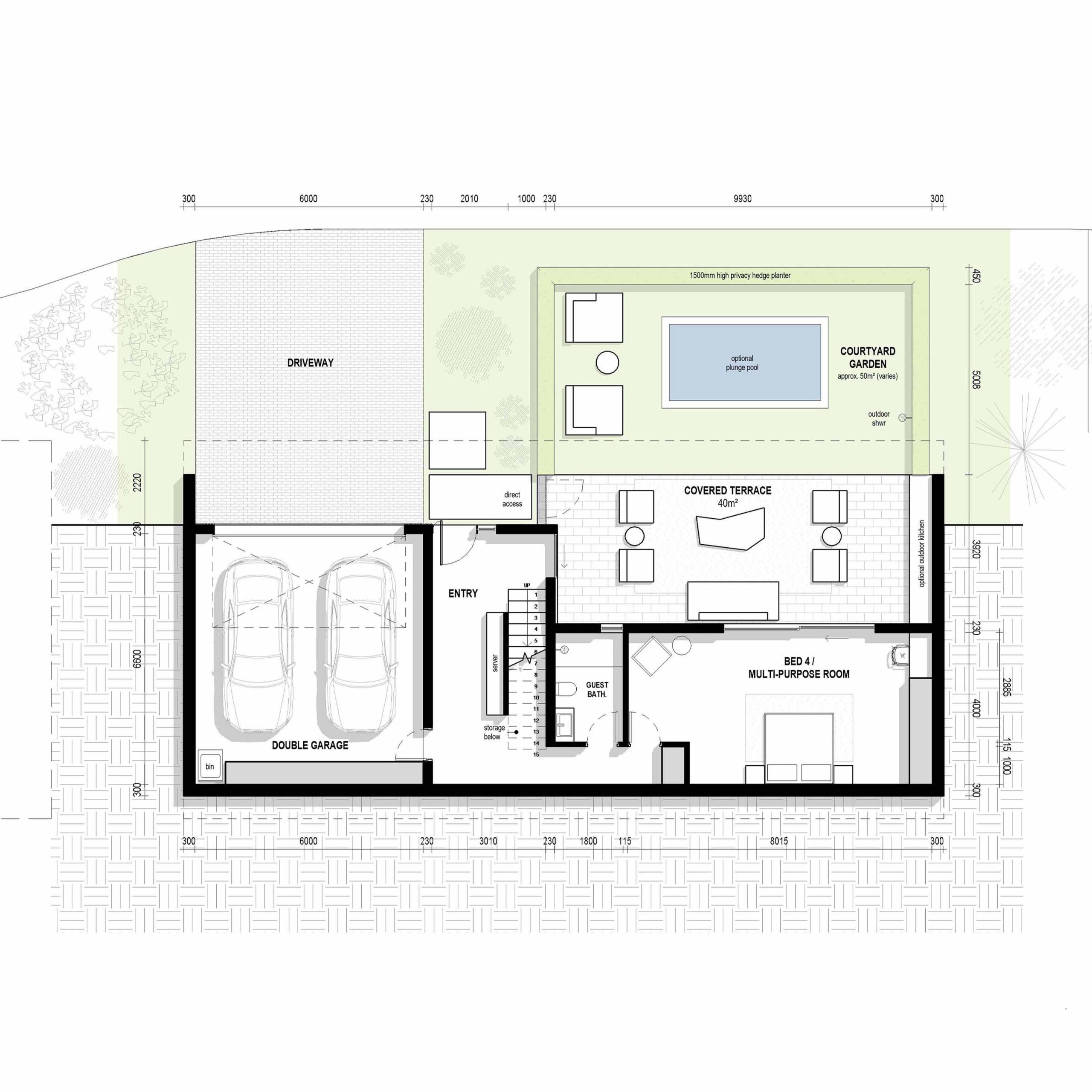 Covered Terrace: 40m² | Garage: 45m² | Entry, Stairs & Guest Bath: 34m² | Multi-purpose Room: 35m²